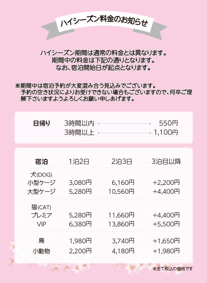 【ハイシーズン料金のお知らせ】